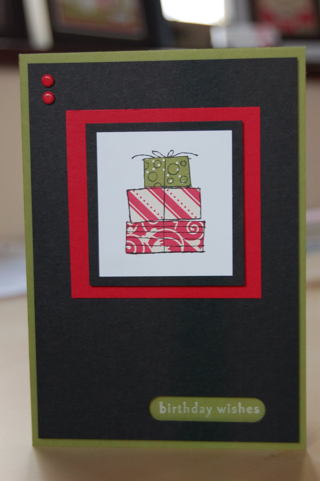 If you read yesterday’s post, this is the second “man” card that I made, and I am still not 100% convinced that its manly enough but I liked the finished product and as it was for a young man I decided it would be suitable. The stamp is from “Happy Moments” which was one of the Sale-a-bration sets which sadly is no longer available. The greeting is from “Wow Flowers” which I tend to use frequently as it fits perfectly inside the Word Window Punch. My colour combination was Whisper White, Basic Black, Old Olive and Ruby Red and my greeting was stamped using the Kraft Whisper White ink.