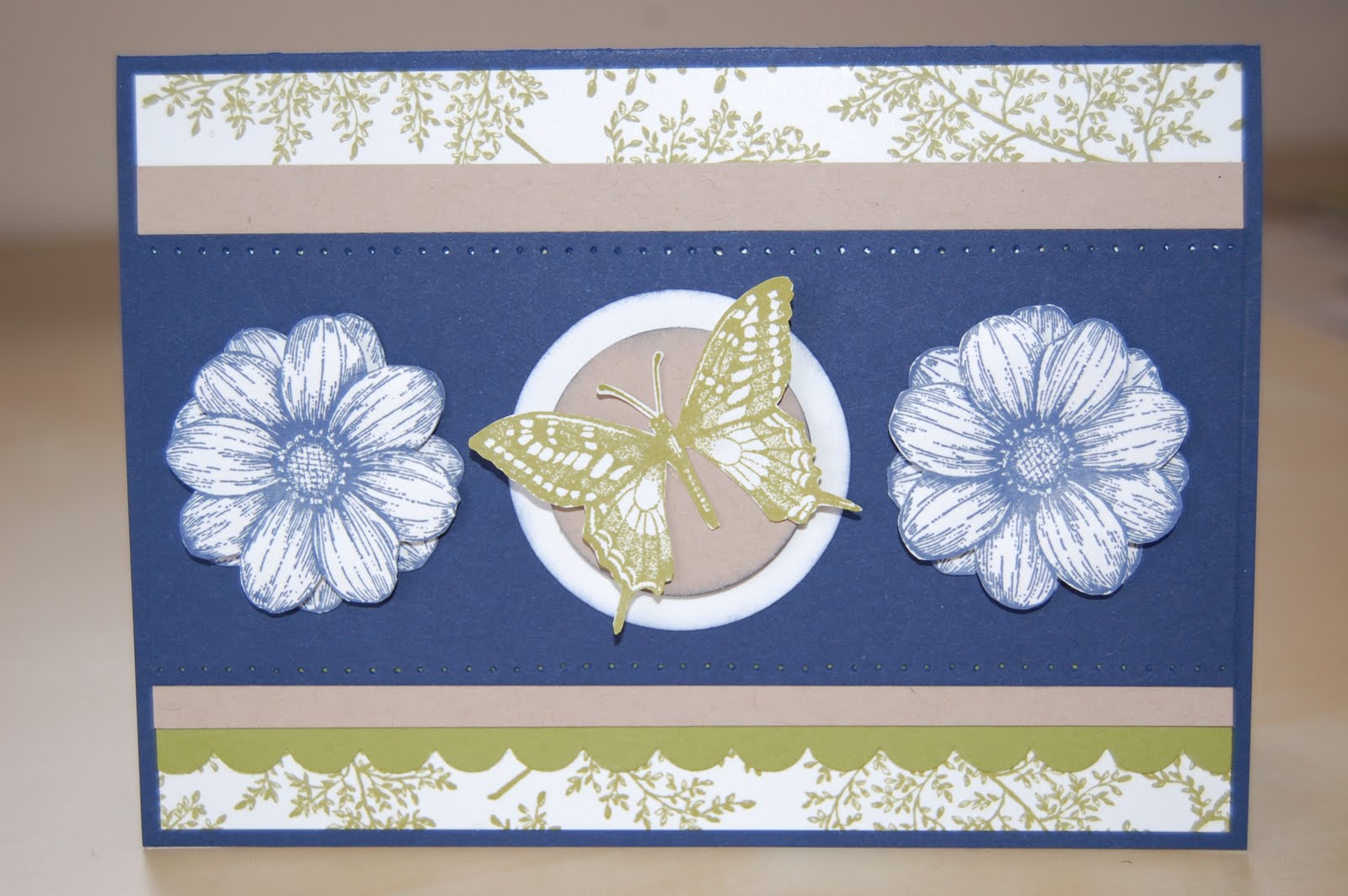 Here is one of the cards we completed using “Touch of Nature” which is a really lovely set comprising of 7 stamps, all with a nature theme. For this card we only used 3 of the stamps, one for the background and the two on the main layer of the card. We stamped the flower four times and used Dimensionals to raise two on top of each other. The butterfly image was stamped using Old Olive ink, hand cut and adhered only along the body so that its wings were free to fold up giving it a 3D effect!