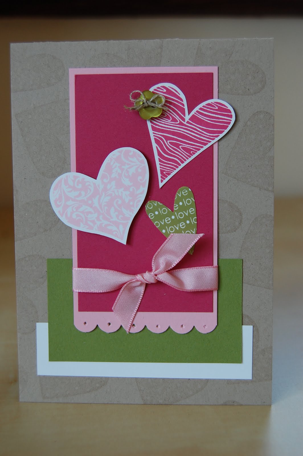 The background was stamped using Versamark with the Spotty Heart stamp and the main heart images were stamped in Rose Red, Pretty in Pink and Old Olive. I added one of the “Playground” Designer Buttons to one of the hearts tied with a bow using the Linen Thread then adhered with a Glue Dot. To finish I tied a piece of co-ordinating Taffeta Ribbon around my top layer to add some texture.
