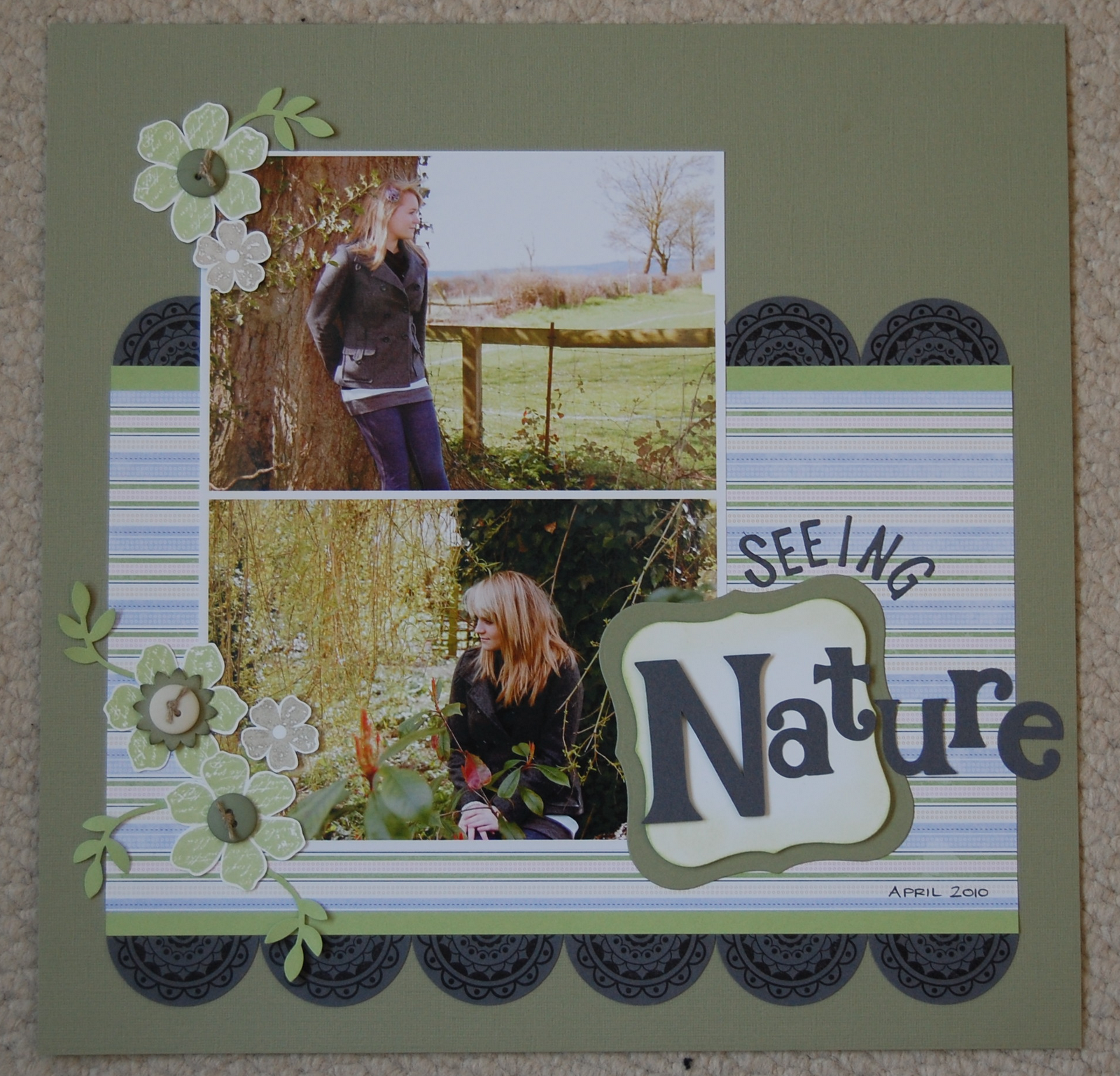 Just need to add some journalling now and I have left the space behind the photos “unstuck” so that I can slip a piece of cardstock behind, add a tab then it can be pulled up and down to view. I love to journal on my layouts, I feel it is an important part of scrapbooking, but sometimes I like to “hide” the journalling as it may spoil the look of a layout or there just might not be room for it!