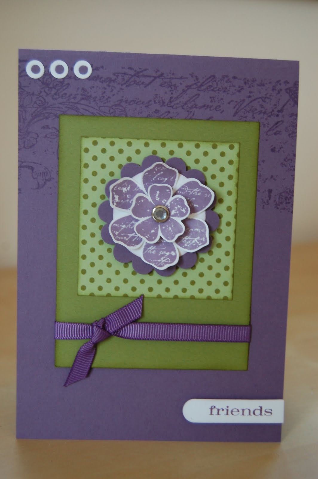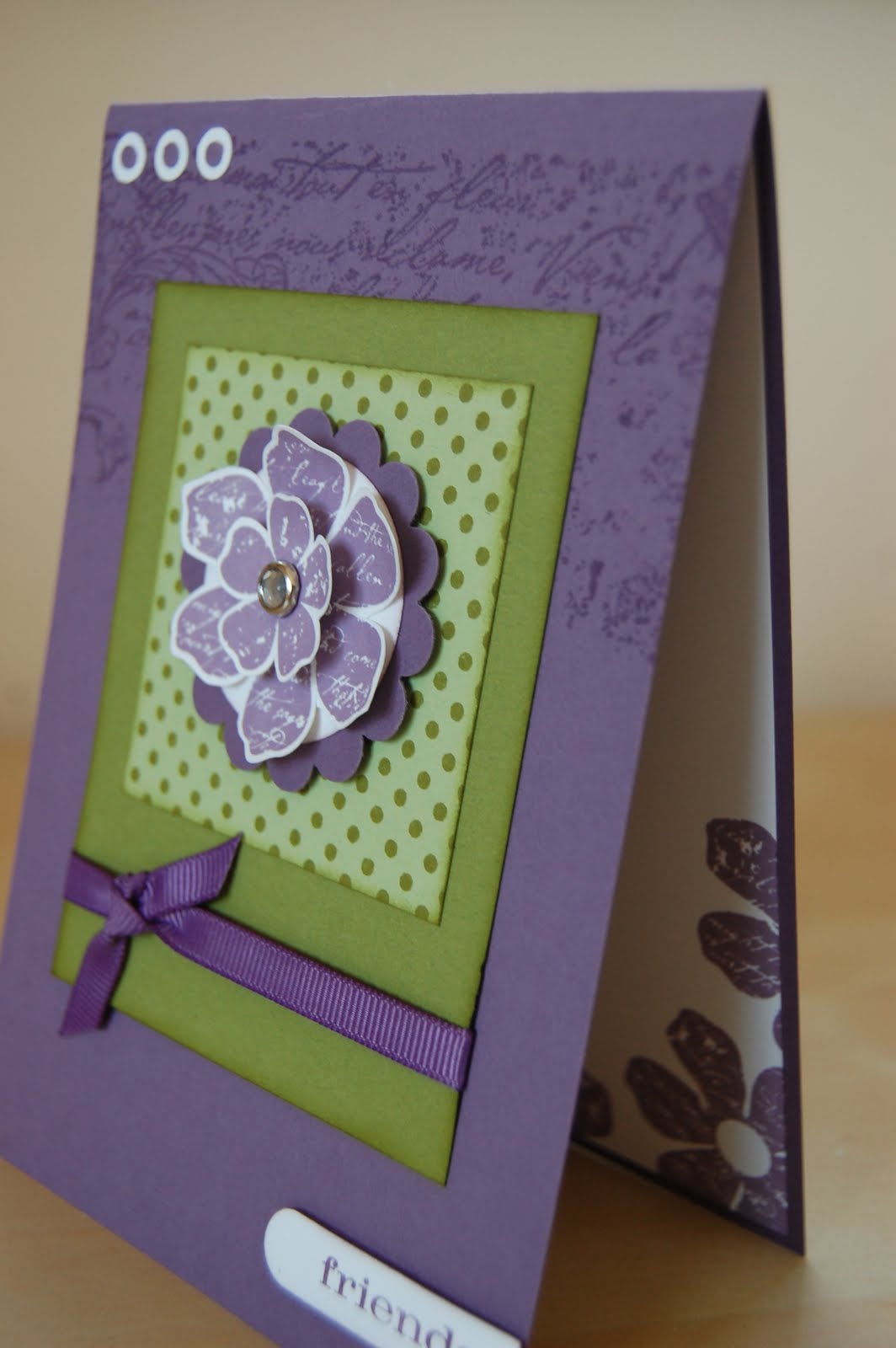 The flower stamps are from “Vintage Vogue” and we used the Jumbo Wheel “Very Vintage” at the top of the card. We used the gorgeous “Dot, Dot, Dot” background stamp with Old Olive ink, stamping onto Certainly Celery card. Our greeting “friends” was taken from the Friends stamp in the “Vintage Vogue” but instead of using the whole image, we just coloured in the word “friends” with the Perfect Plum Stampin’ Wrtite Marker Pen and punched it out with the Word Window Punch. The ribbon we used was Elegant Eggplant 1/4″ Grosgrain.