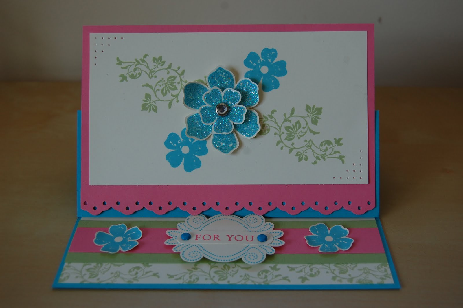 The Easel Card consisted of Tempting Turquoise, Regal Rose and Certainly Celery cardstock along with Very Vanilla for the stamping layers. I had seen a similar style card but wanted to use some bright and cheery colours and these seemed to work quite well. We used “Vintage Vogue” for the Flowers and leaves and also “Frames with a Flourish” for the label and “Basic Phrases” for the greeting.