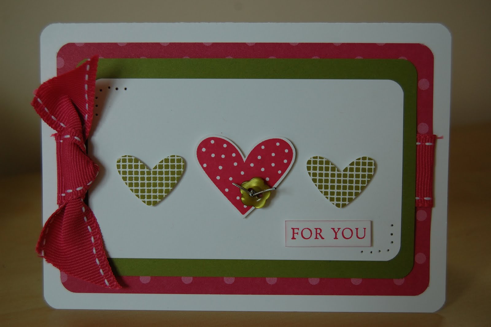 “I {heart} hearts” is a very versatile set, some of the stamps co-ordinate with the punches too. I added some of the gorgeous 1″ Double Stitched Ribbon in Rose Red to match and also one of the Designer Buttons which I attached to the centre heart with a glue dot. My greeting is from “Basic Phrases”. The DSP is from the Patterns packs in Rose Red.