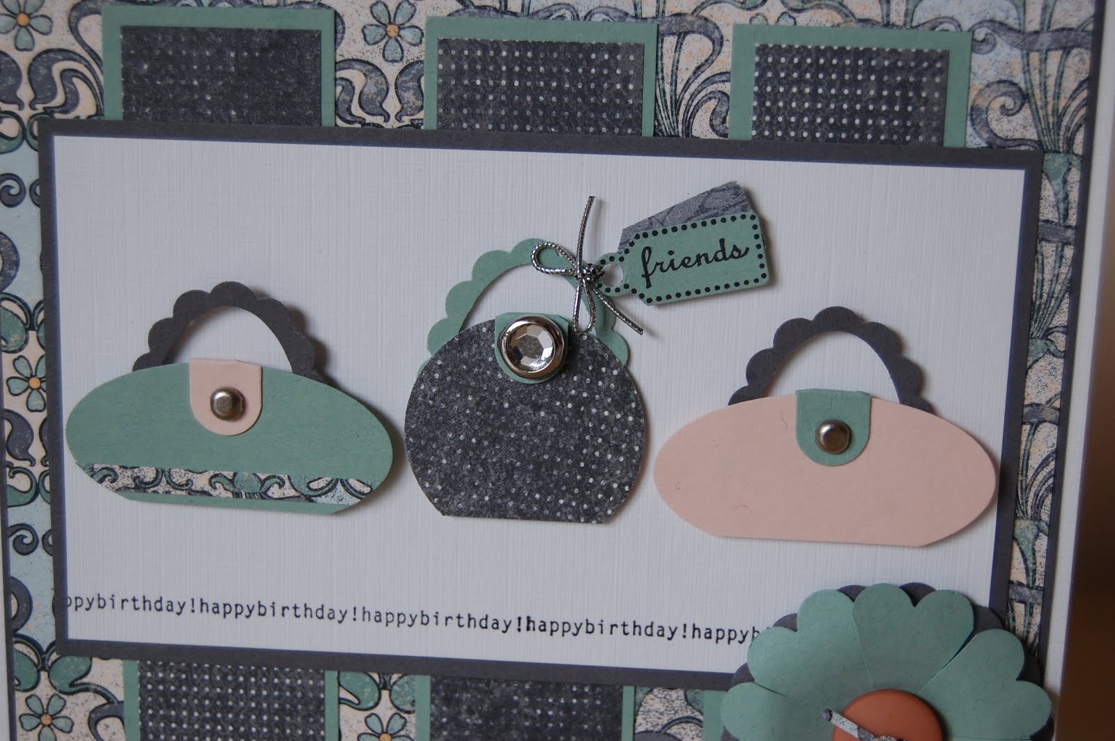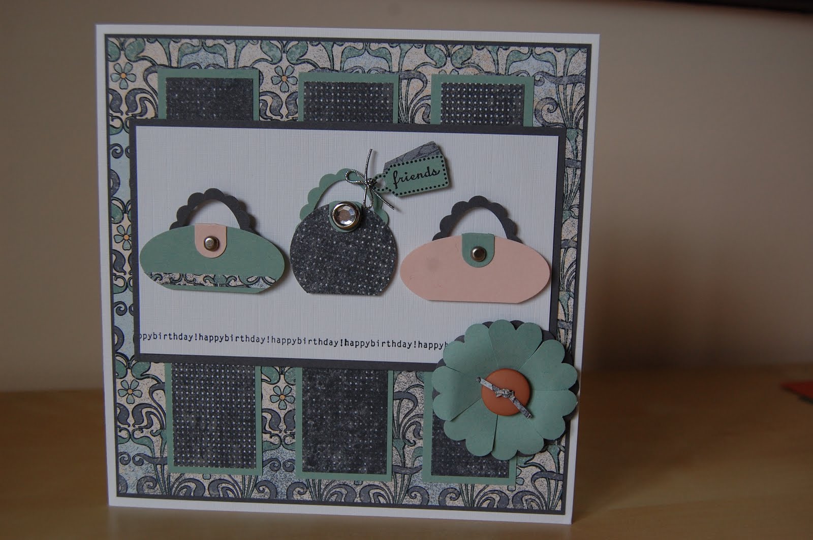 I matched my cardstock to the papers and used a sketch from a Challenge blog that I liked. My flower was created using the Scallop Circle Punch with a button adhered to the centre. The “Happy Birthday” greeting running along under the hand bags is from “Big Bold Birthday” and I stamped this in Basic Black ink and used the Stamp-a-ma-jig to create a whole line of greetings.