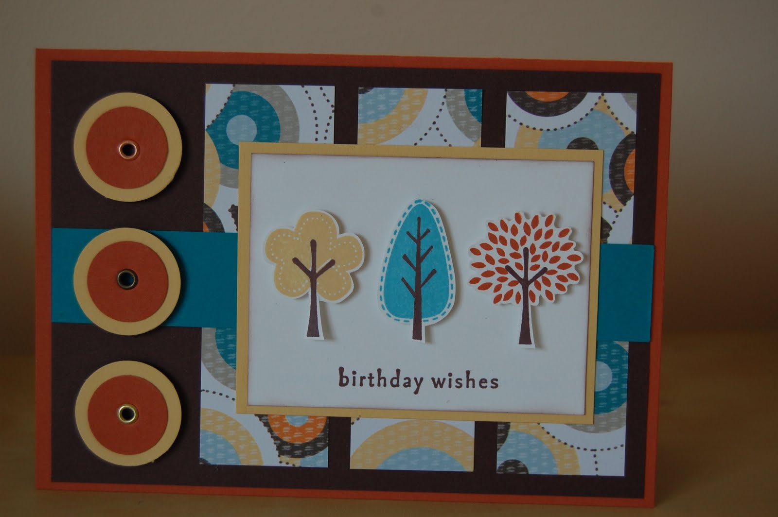 We used the Cropadile to set the eyelets in the three circle layers and the lovely Stamp-a-ma-jig for placement of the trees as “Trendy Trees” is a “2 Step Stampin” set. If you would like more information about how “2 Step Stampin” sets work, just drop me an email and I will explain. Once again we had some hand cutting, my ladies just “lurve” hand cutting and they all jump with joy when they see that they have to cut something out by hand and not use a punch to do it!!!! Well, I can’t make it too simple for you! The greeting was stamped using Chocolate Chip Ink and is from “Wow Flowers”.
