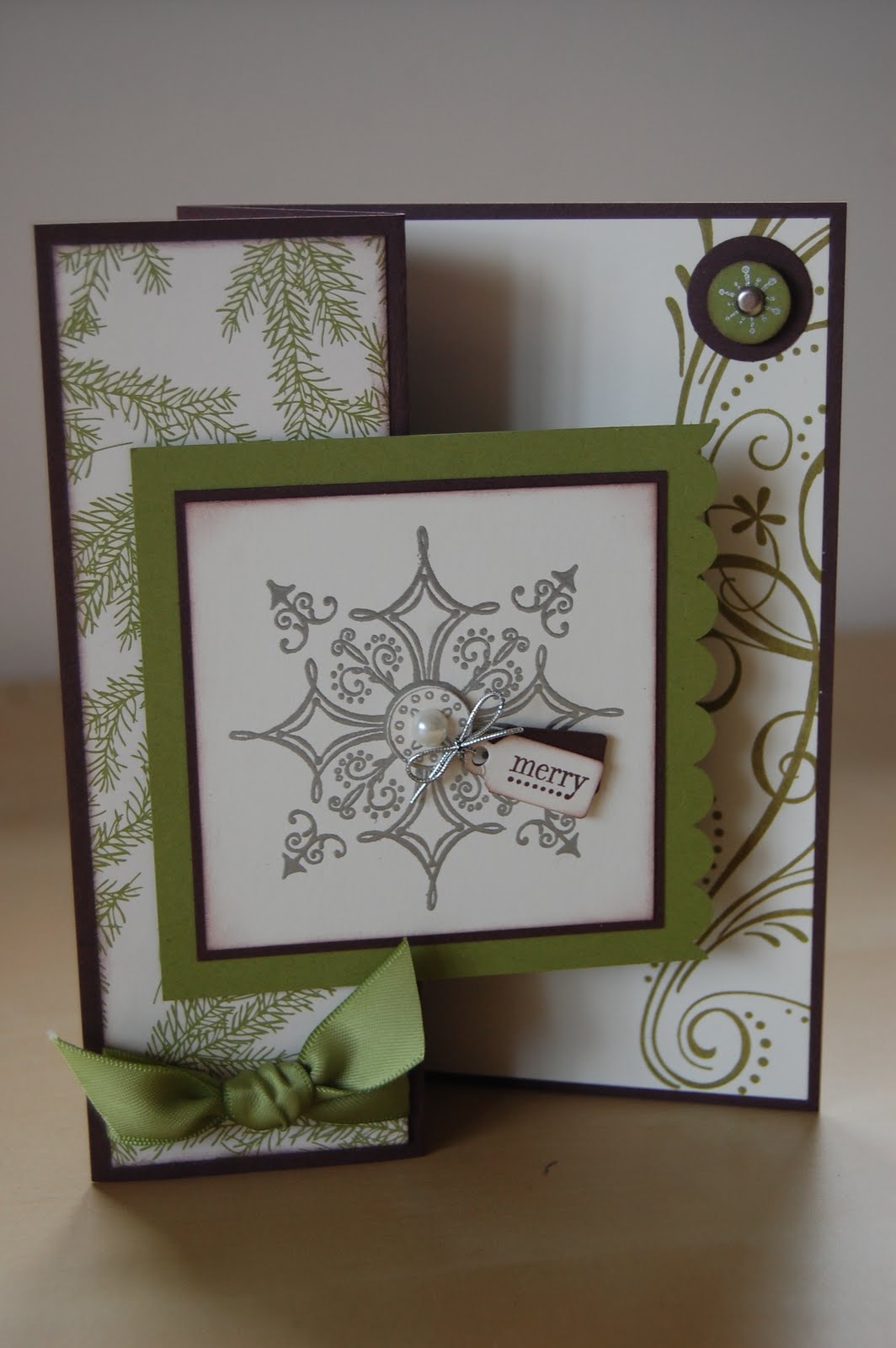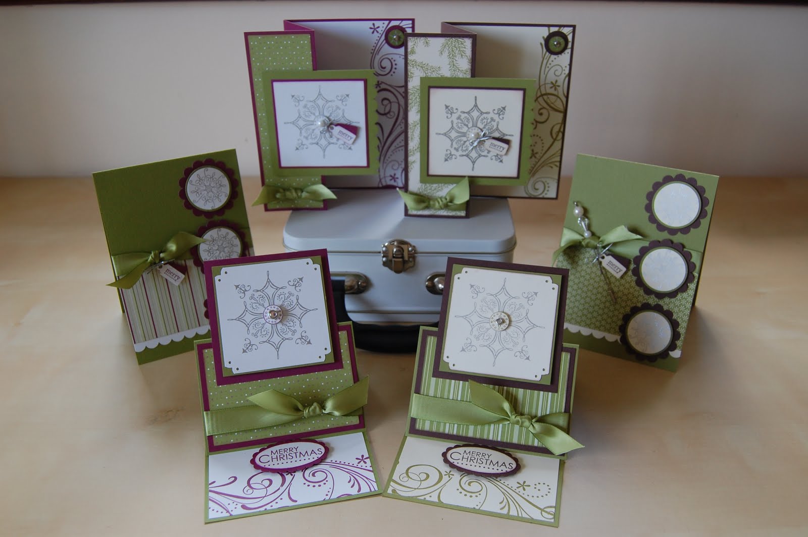 We made six cards in total, 3 designs, 2 of each colourway, Old Olive/Chocolate Chip and Old Olive/Rich Razzleberry. We also used the “Merry Christmas” greeting from “Season of Joy” stamp set and the Jumbo Wheel “So Swirly” along with the cute “Tiny Tags” and these all worked together lovely. Here’s a close up of the cards: