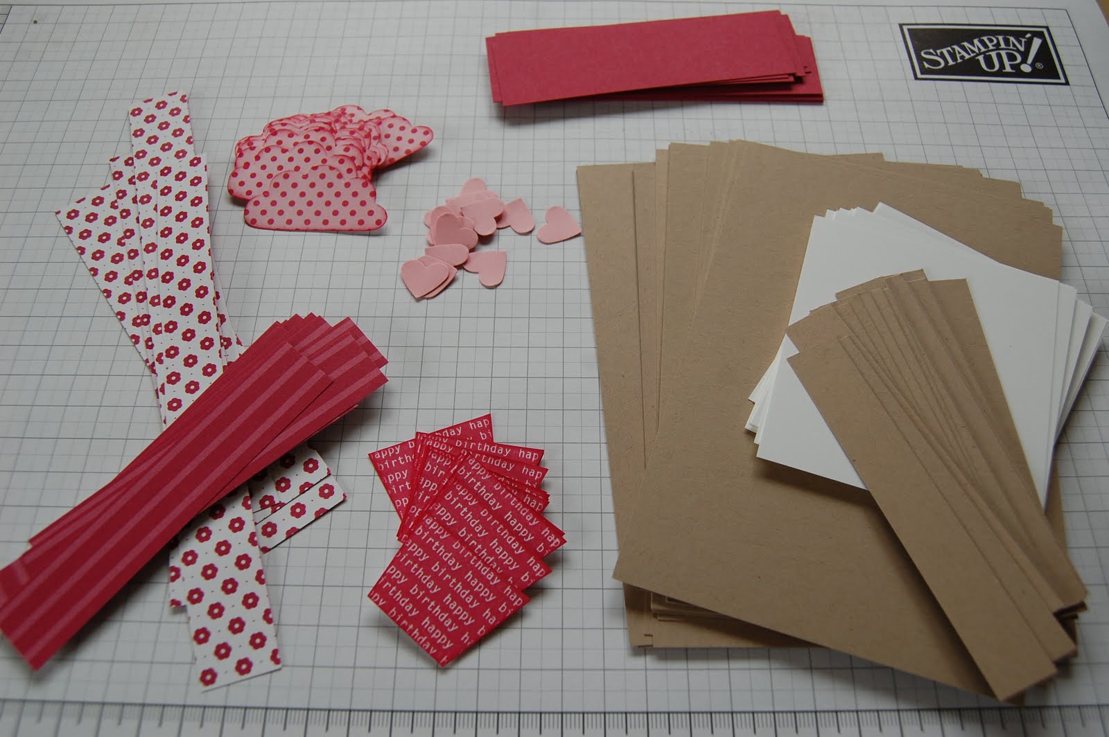 I have been using “Big Bold Birthday” on some recent projects so decided to use it again for my swaps. I chose some of my favourite colours, Rose Red, Pretty in Pink and Kraft and teamed with Whisper White. I am so glad that these colours will be staying in October when the renovation happens, although Kraft is being re-named as “Crumb Cake” which may be confusing for a while!