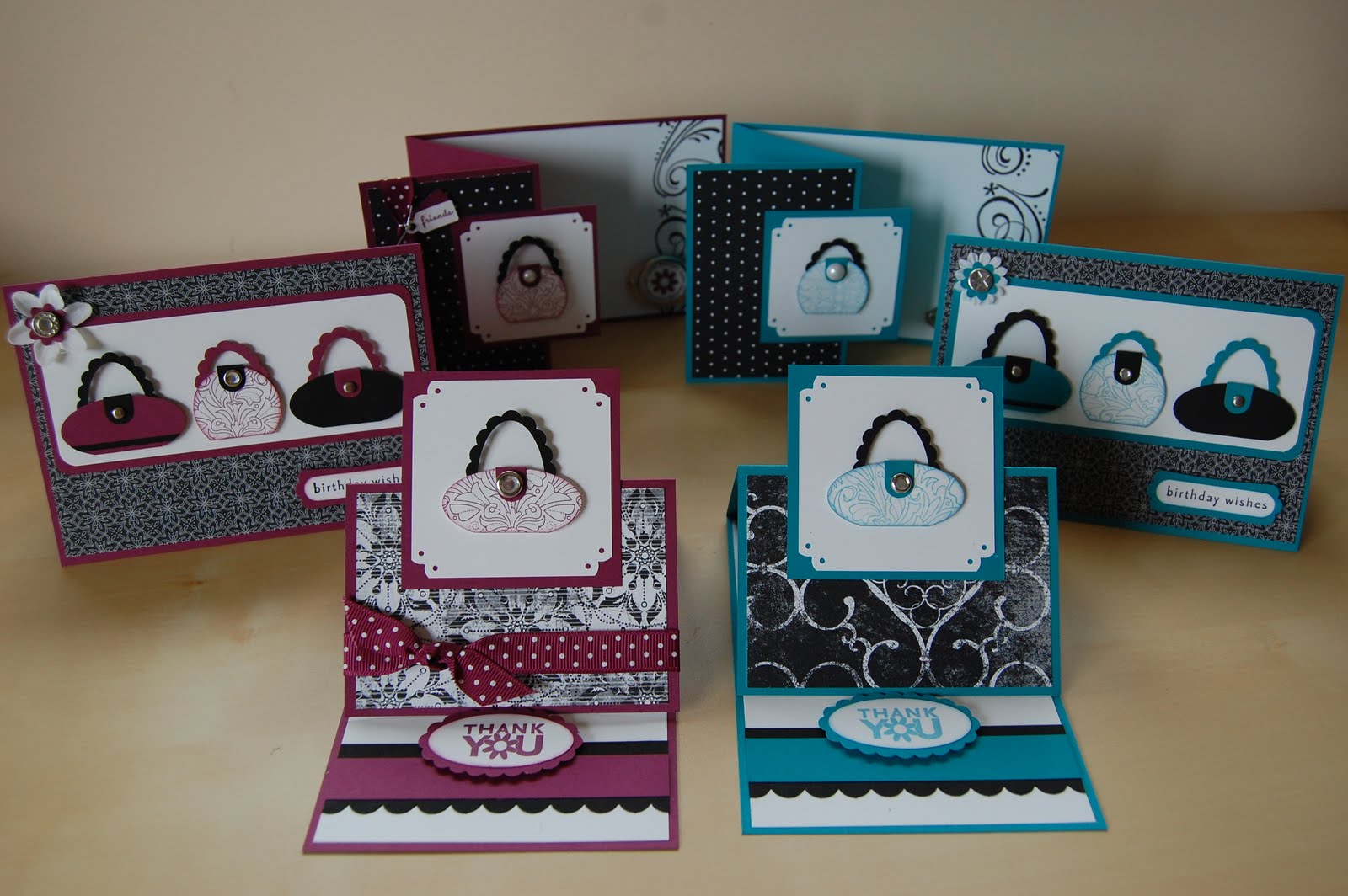 We will be creating six cards using the punches to create cute little handbag embellishments. There are three card designs in two colourways, Basic Black with Rich Razzleberry and Basic Black with Taken with Teal.