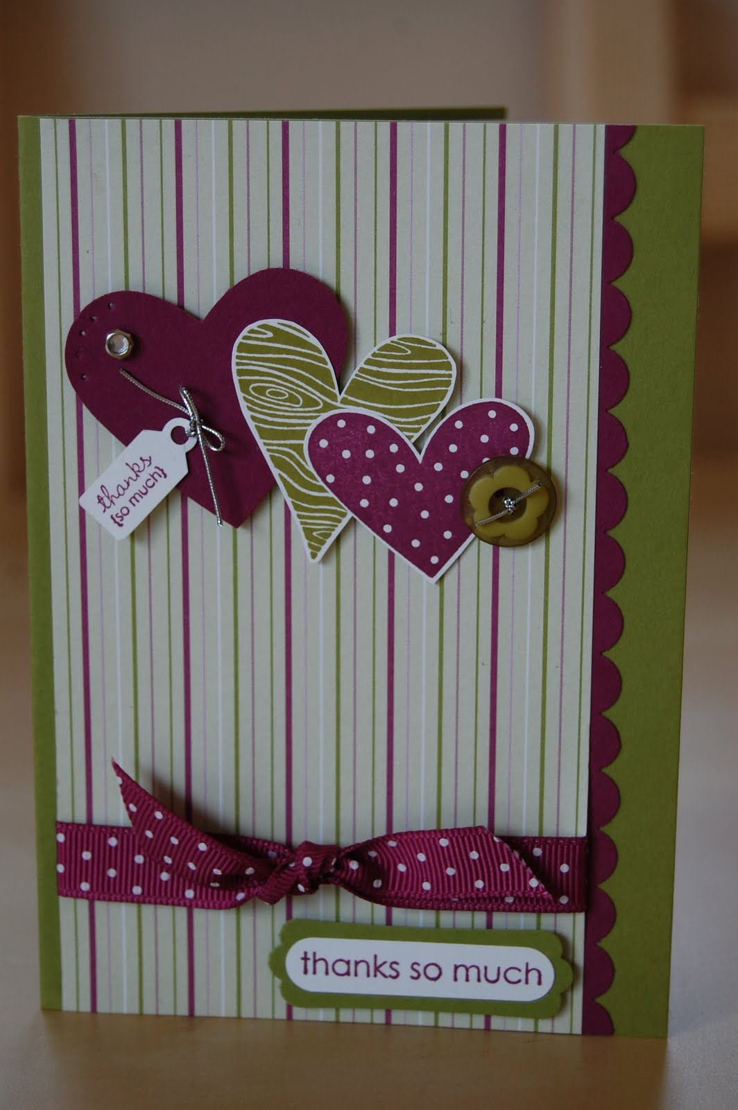 My colour combo is Rich Razzleberry and Old Olive teamed with Whisper White which I love. I punched a Rich Razzleberry heart using the Large Heart Punch and added a small clear Rhinestone brad and a tag stamped with “thanks so much” from the “Tiny Tags” set which I puched out using the Medium Jewlery Tag punch. I stamped two hearts, one Old Olive and one Rich Razzleberry and hand cut them, layering them over the large heart. I added a gorgeous Old Olive button from the Playground Buttons pack and tied with Silver Elastic Cord.