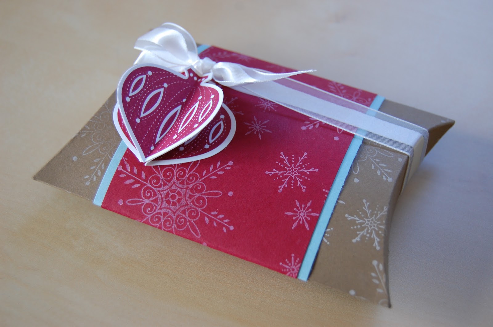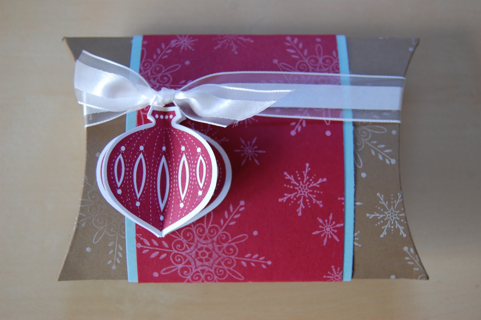 We stamped snowflakes from the “Serene Snowflakes” set in Kraft Whisper White ink all over the Soft Suede base and Cherry Cobbler belly band. The layer beind the Cherry Cobbler piece is Baja Breeze. The Ornament stamp is from “Contempo Christmas” and we stamped this 3 times then punched them out using the Ornament Punch, sticking them together to create a 3D decoration for our Pillow Box. We tied a piece of Organza ribbon around the whole box with a knot just above the ornament so it looks like it is hanging from it!