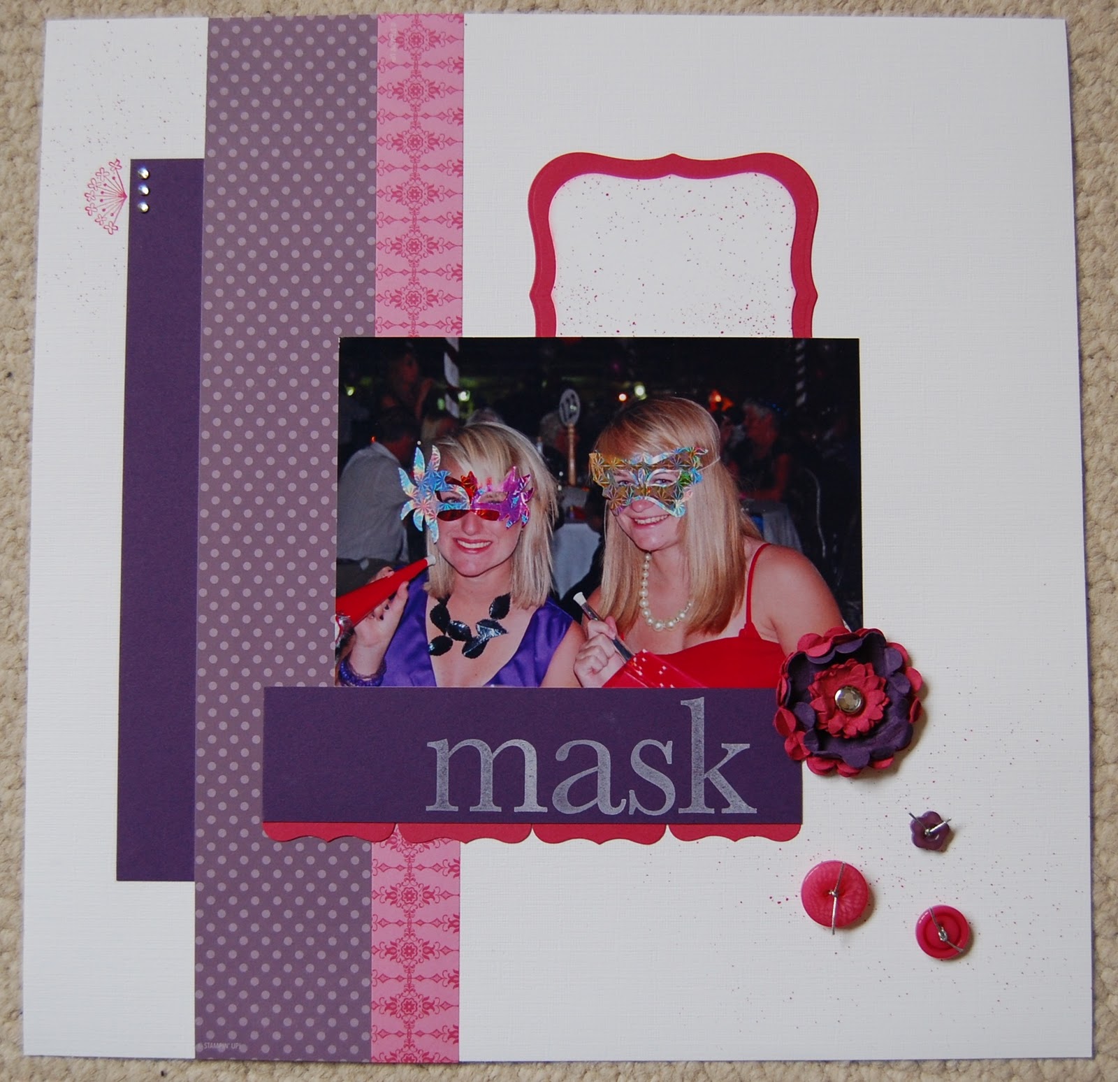The patterned papers are from the 12×12 Designer Paper Stack in the subtles collection which is gorgeous. We created our 3D flower using the Scallop Circle and Boho Blossoms punches adding a Clear Rhinestone brad to the centre. We also added some of the delicious Designer Buttons for extra texture to our page. It is difficult to see from the photograph but we used the Colour Spritzer Tool to create a soft subtle background with the Rose Red Marker Pen.