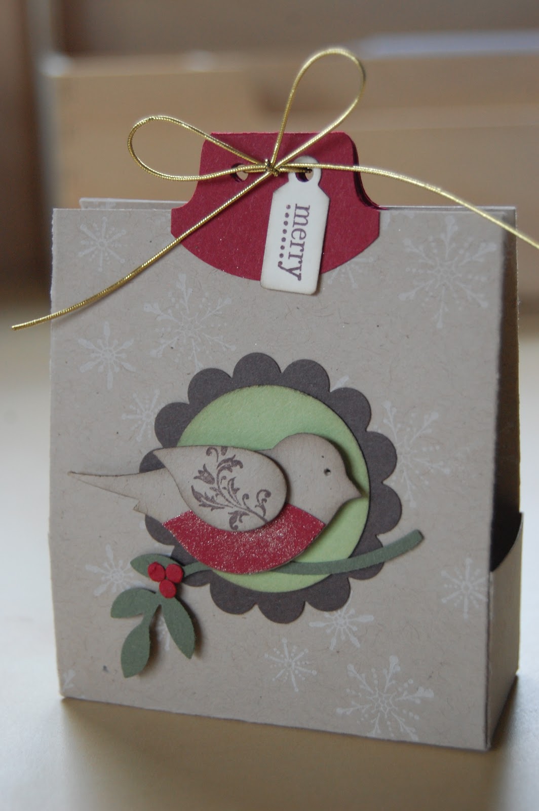 I always like to give a little gift to one of the guests at a home workshop and this was what I had created for Lucy’s. I used the “Two-step Bird Punch” to create the Christmas Robbin using the colours Crumb Cake and Cherry Cobbler, I stamped his wing using one of the beautiful decorative flourish stamps from the “Tiny Tags” set. The “merry” greeting is also from “Tiny Tags”, punched out with the co-ordinating Medium Jewelery Tag Punch. My gift bag base was Crumb Cake cardstock and onto this I used stamps from the “Serene Snowflakes” with Kraft Whisper White ink which is gorgeous. To finish I tied Gold Elastic cord at the top in a bow.
