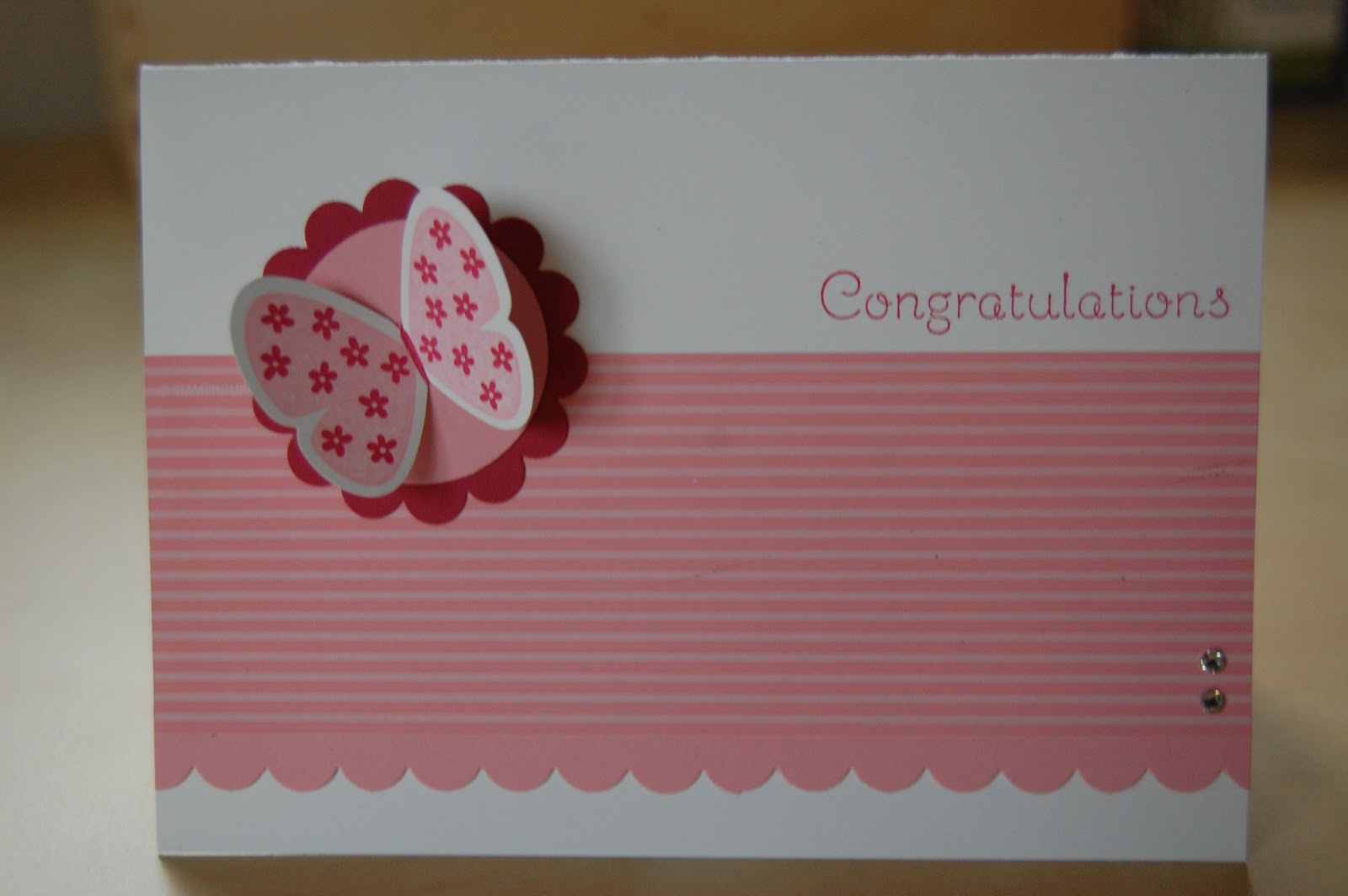 Our second card at the class was created using “Flight of the Butterfly”. The greeting is from the Hostess set “Occasional Quotes”, stamped in Rose Red ink. The Designer Series Paper is from the Subtles Stack and we added a strip of Pretty in Pink cardstock punched with the Scallop Border Punch at the bottom. To finish we added two basic Rhinestones to the DSP layer.