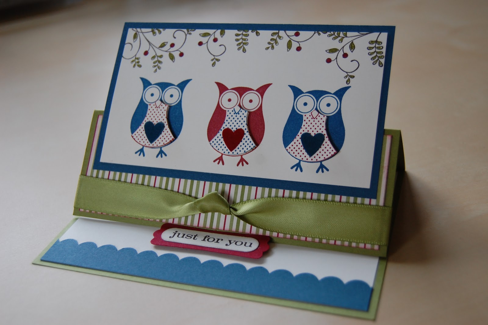 My colour combo here is Old Olive, Not Quite Navy and Cherry Cobbler teamed with Very Vanilla, quite manly colours but it suits well and could easily pass for a Valentines Card!! The “just for you” greeting is from “Just Believe” punched out using the Word Window Punch and layered onto a Modern Label punch out in Cherry Cobbler. The ribbon is the 5/8″ Satin in matching Old Olive. The piece of Designer Series Paper is from “Jolly Holiday”, a Christmas themed pack which can be used all year round!