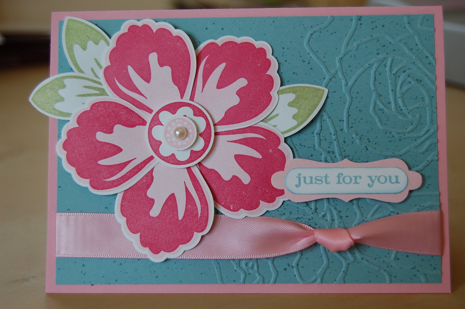So “Build a Blossom” is a 2 Step Stampin’ Set that requires the use of the Stamp-a-ma-jig although you can use these stamps to build flowers without it. Firstly I stamped a Pretty in Pink flower base then added the second stage over the top in Rose Red ink, it is hard to see from the picture as the base of the flower almost looks white. The “leaves” are not actually the leaves from the set, these are flower petal stamps but I liked them as leaves!! Now if you are liking this set, it is available in Wood £24.95 or Clear Mount £19.95 and the co-ordinating “Blossom Petals Punch” is £15.50.