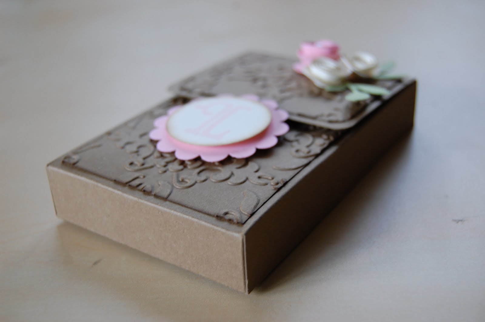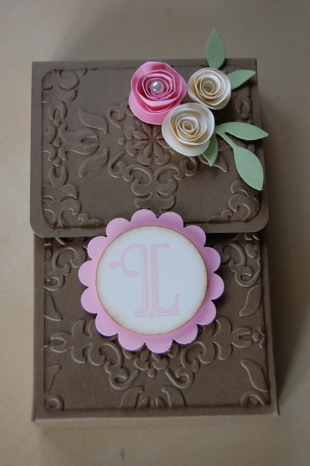 So I used the idea from the Tisse Pack Box that we created at a previous class and I just resized it to fit the Colour Coach. Again I used the “Vintage Wallpaper” Embossing Folder to create the gorgeous textured layers. I used the letter “L” from the “Broadsheet” Alphabet set to decorate the closure for the box.