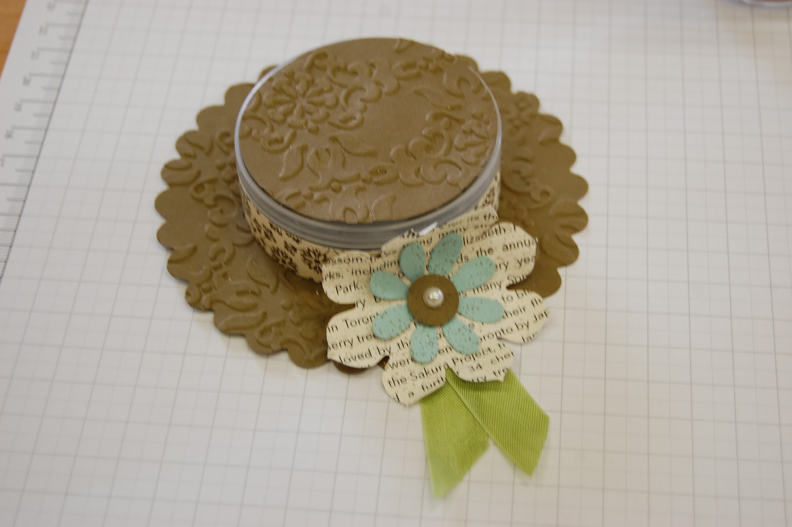 This bonnet was created using a brad pot and I decorated it using the Scallop Circle Die for the base, Circles#2 die for the top circle, both of which I ran through the Big Shot with the Vintage Wallpaper Embossing Folder. The gorgeous flower on the front was die cut using the “Blossom Party” Bigz die which is in the Spring Mini Catalogue and remember items from this mini are only available until the end of April.