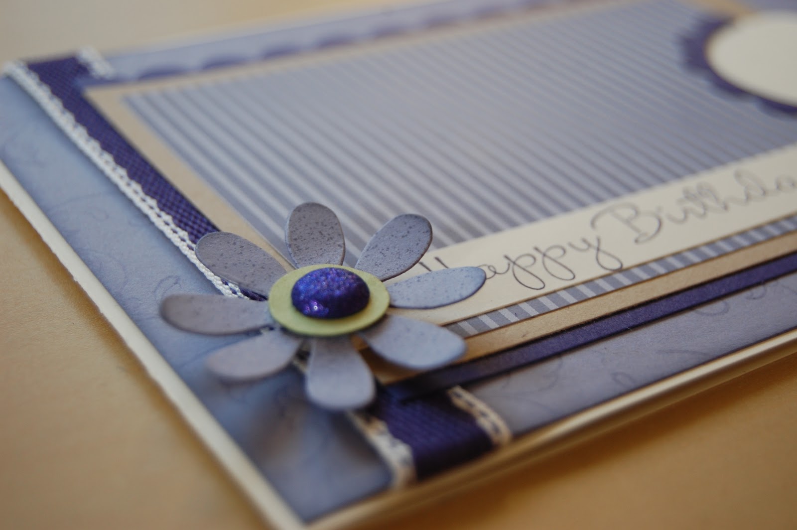 We used the “Blossom Party” die with the Big Shot to die cut the Wisteria Wonder flower then layered with a 1/2″ Pear Pizzazz circle and a gorgeous Concorde Crush Glimmer Brad.