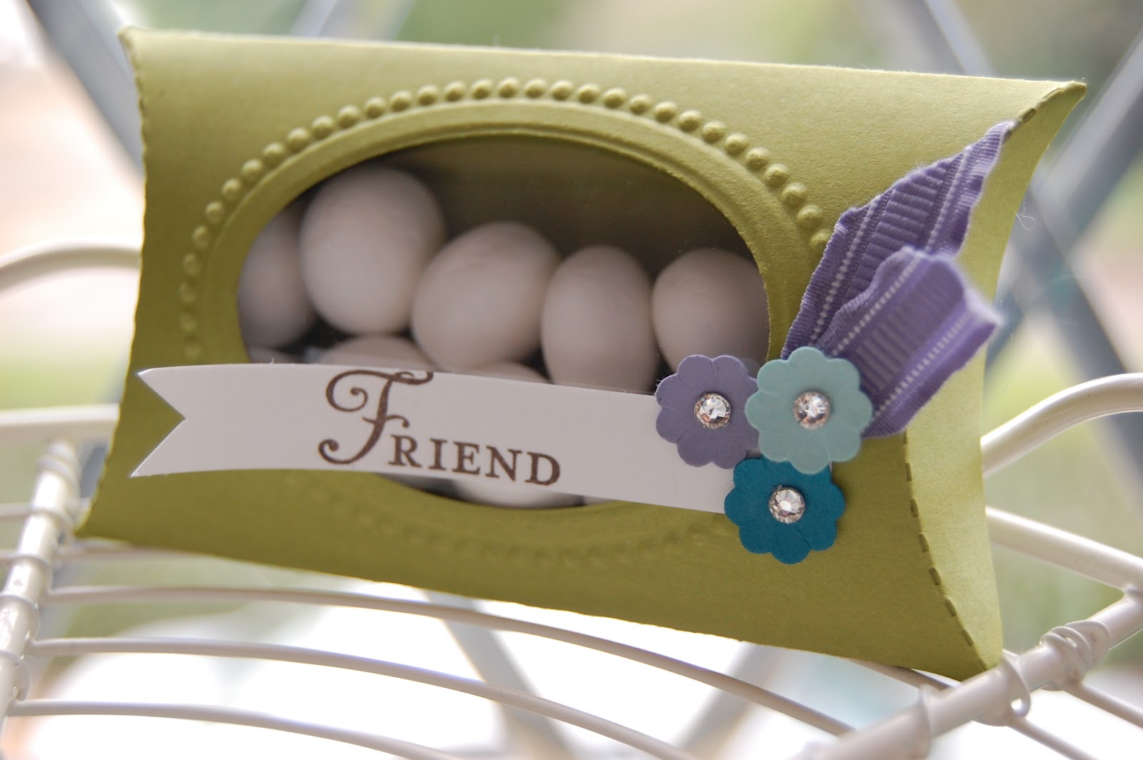 Last but not least this cute little Pillow Box die cut with the Big Shot. Here we also used the Oval Designer Frame in a way that we didn’t get lines from the edge of the embossing folder where we didn’t want them!