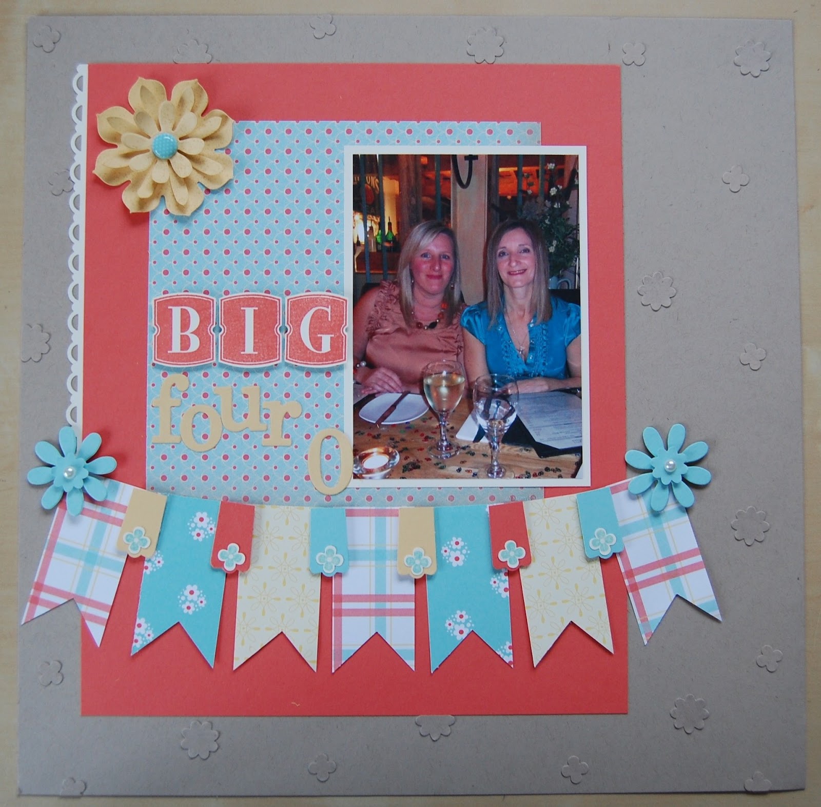 This layout uses yet more of the Sale-a-bration papers but also the “Domestic Godess” paper pack too which are in the same colours. The colour combo is Crumb Cake, Calypso Coral, Pool Party and So Saffron.