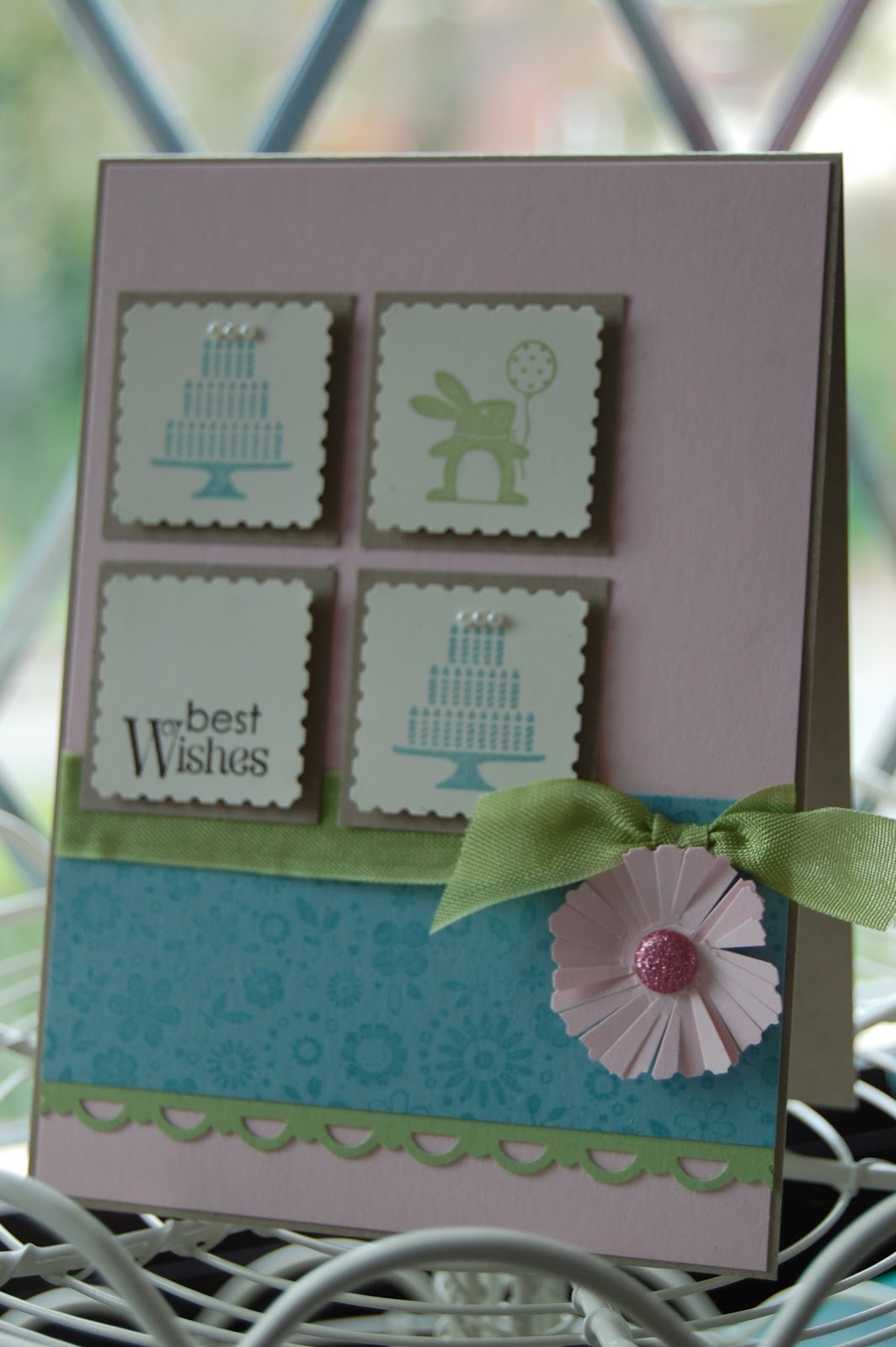 This set is really cute and quite versatile and at only £8.95 for the clear mount option a bargain! I have made many cards using these stamps, from baby, to general, to wedding. As you can see it co-ordinates with the Postage Stamp Punch which I have then layered onto a 1 3/8″ Crumb Cake square.