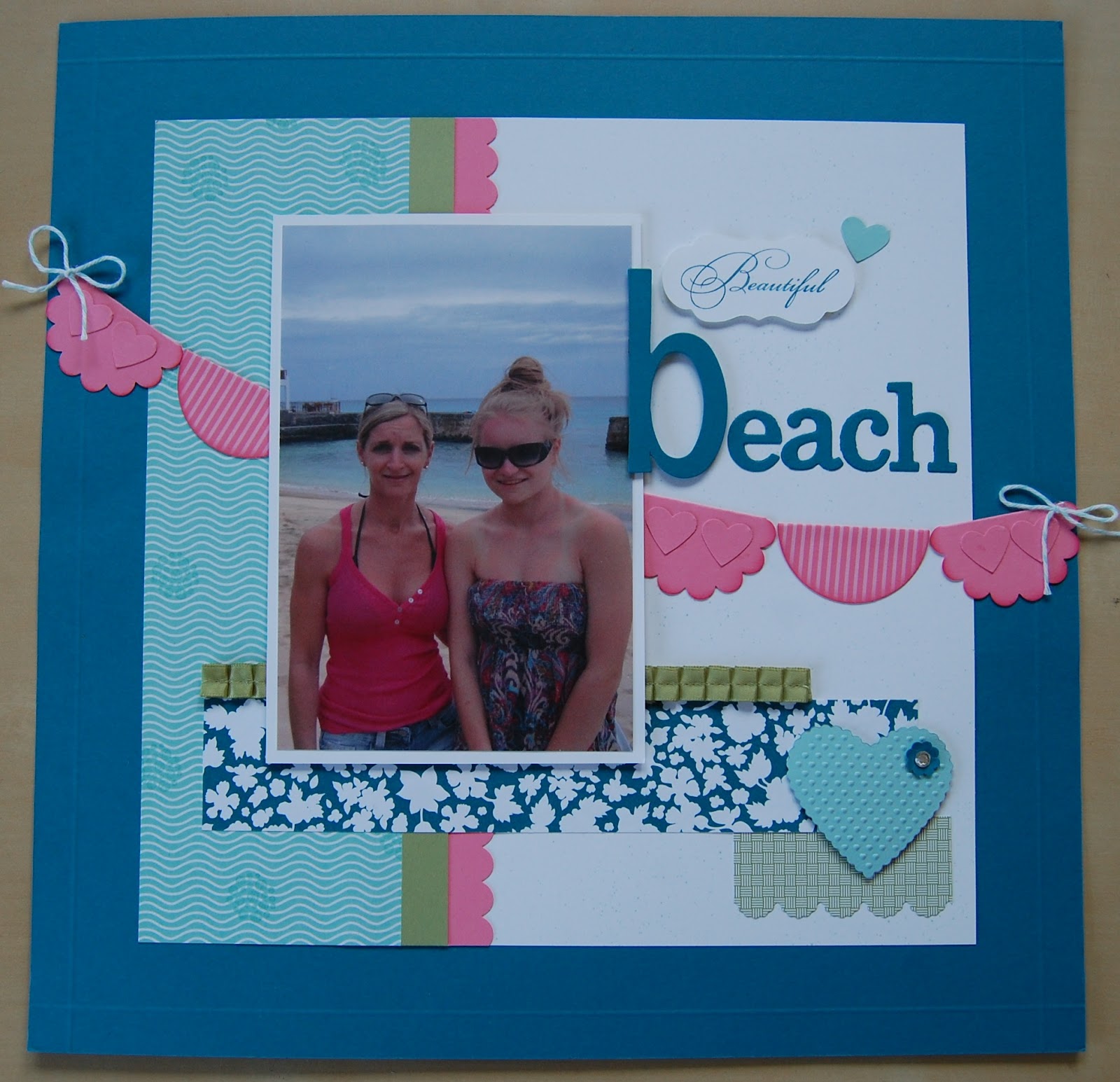 The Pool Party heart was cut using an Embosslit die with the Big Shot machine, finished with an Itty Bitty Flower adorning a Rhinestone. Below it was created a border using the new Edgelits scallop die. A piece of Pleated Pear Pizzazz ribbon added some texture.