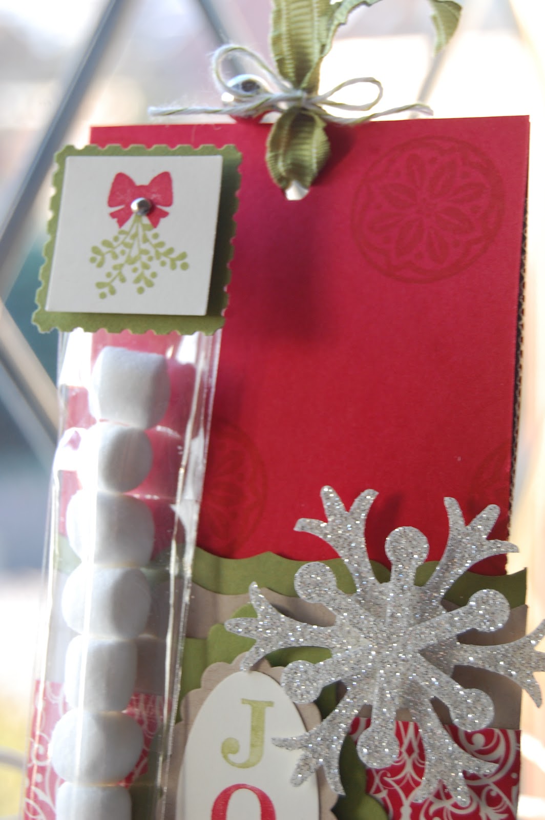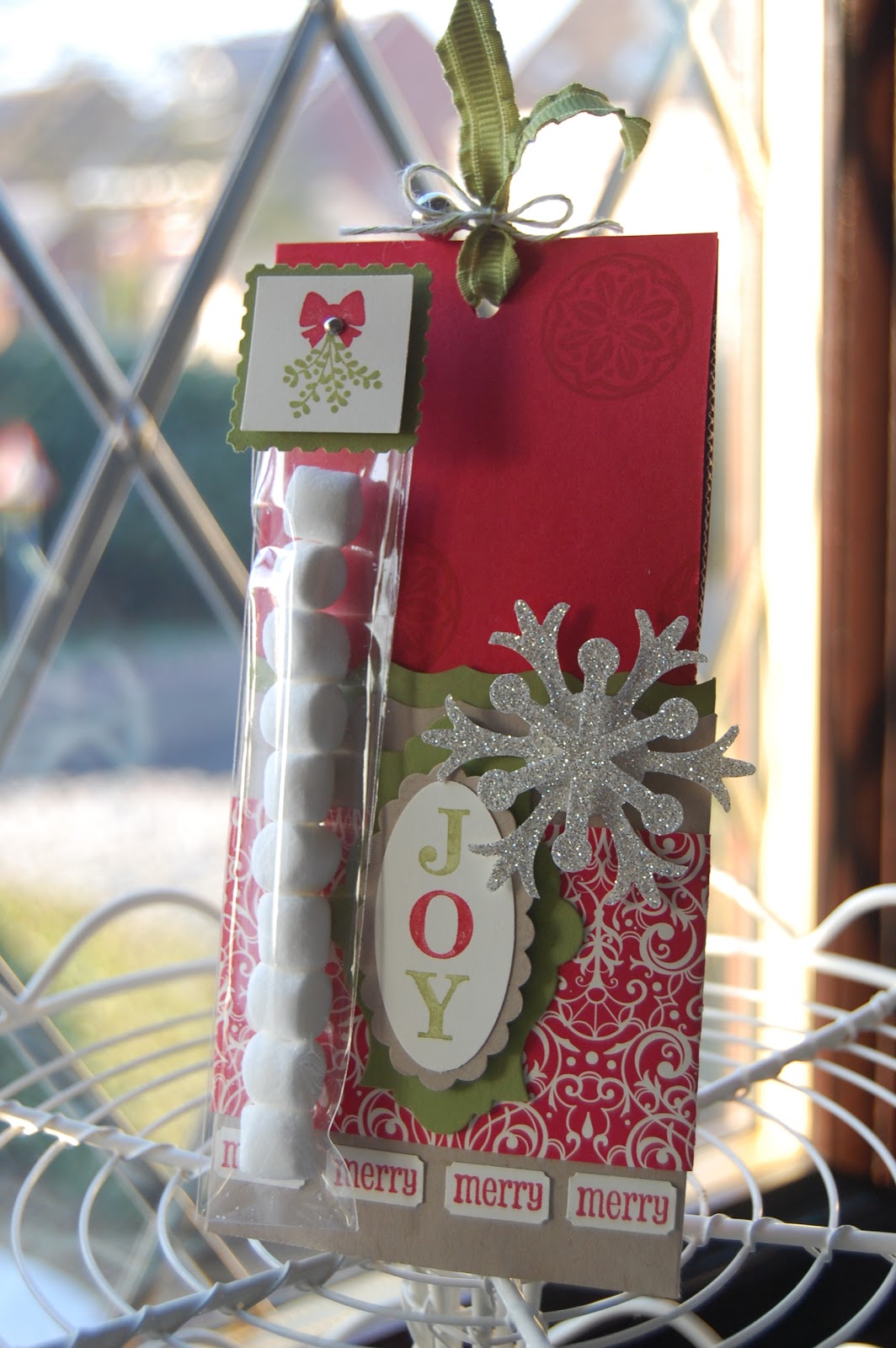 We used the Fancy Favor die on two of our projects this month, firstly on this Hot Chocolate Pouch for the pocket. The Real Red sleeve holds a sachet of Cadburys Hot Choclate and I found yet another use for the “skinny” cello bags which was attached to the sleve with a velcro dot crammed with mini marshmallows.