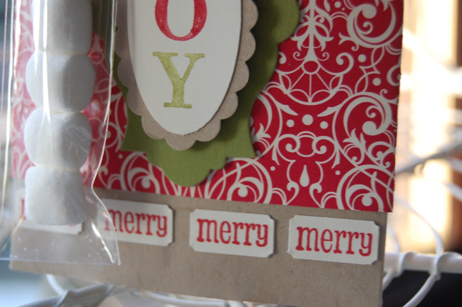 We used the Ticket Duo punch to create the “Merry” detail along the bottom, the wording is from the “Pennant Parade” stamp set and the “JOY” is from “Joyous Celebrations” set inked with the Marker Pens to give a multi coloured finish.