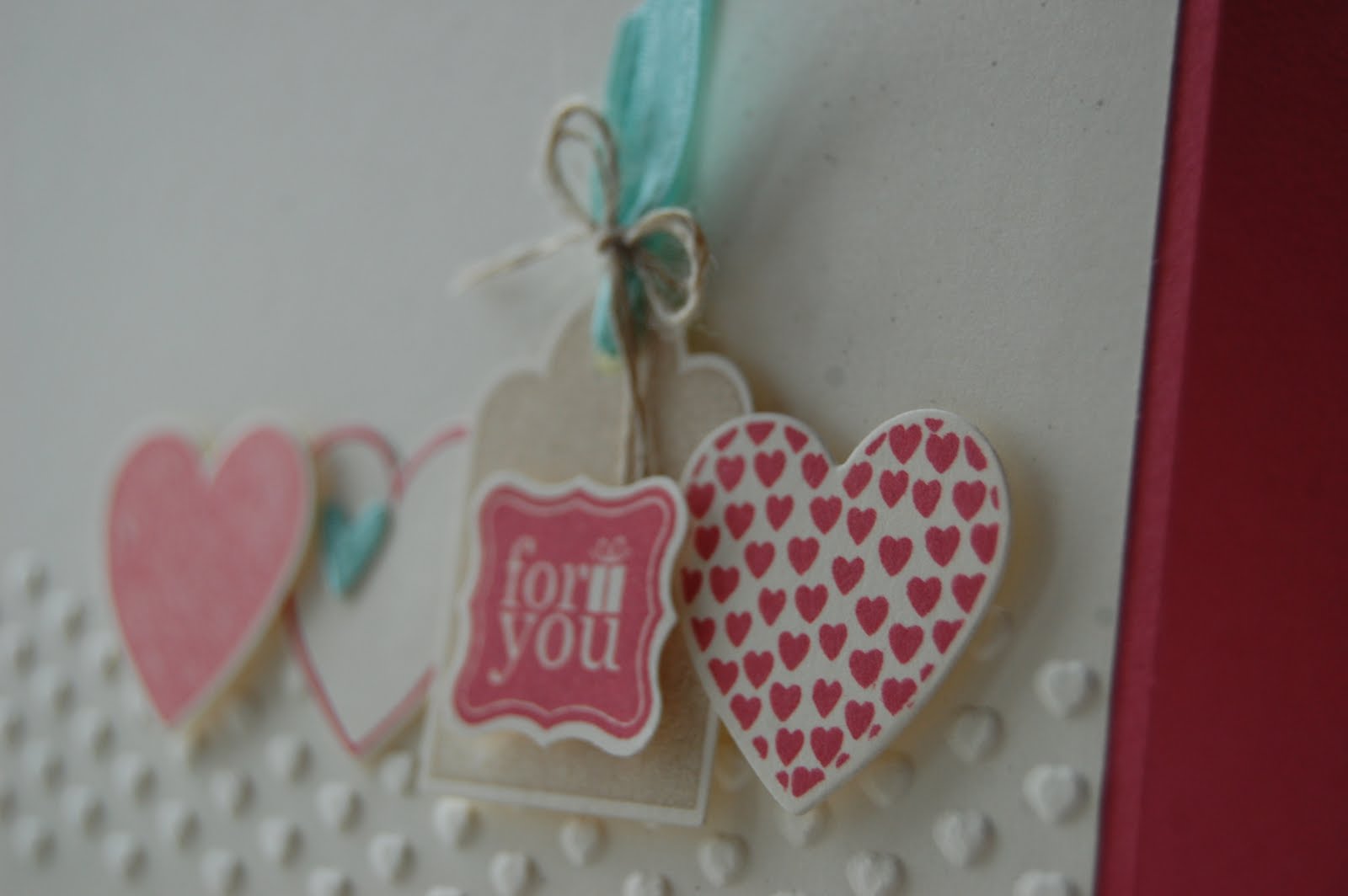 The hearts and “tag/bunting” images are from a stamp set that has matching framelits dies which is fab. I used the Primrose Petals ink on all three hearts but did the “stamping off” technique on the solid heart to give a paler tone.