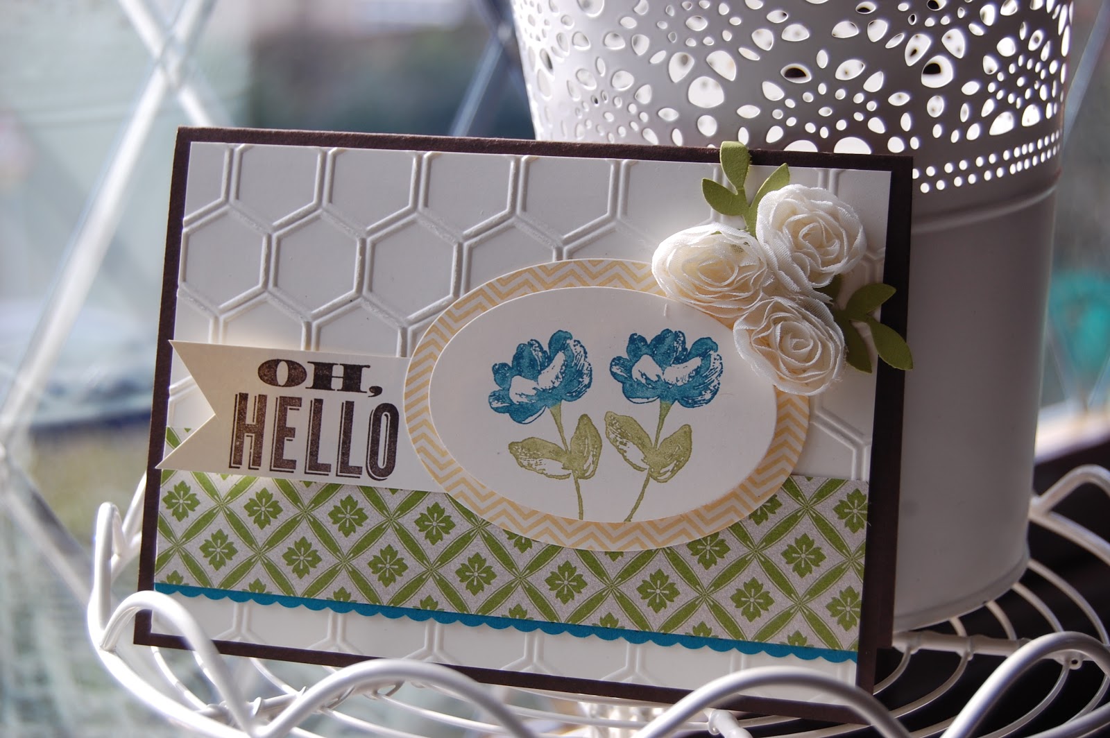 Don’t be deceived into thinking the chevron oval behind the flowers is patterned papers, it’s actually a stamp from the “Oh Hello” set which you can cut out using the new Ovals Framelits dies!