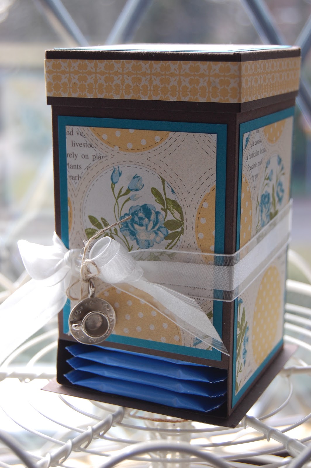 Firstly here’s a Tea Box, it’s been around for a while but I’d never made one before and seen some lovely creations and decided that as we have some gorgeous trinkets available in the new Spring Summer Catalogue it would be a perfect option.