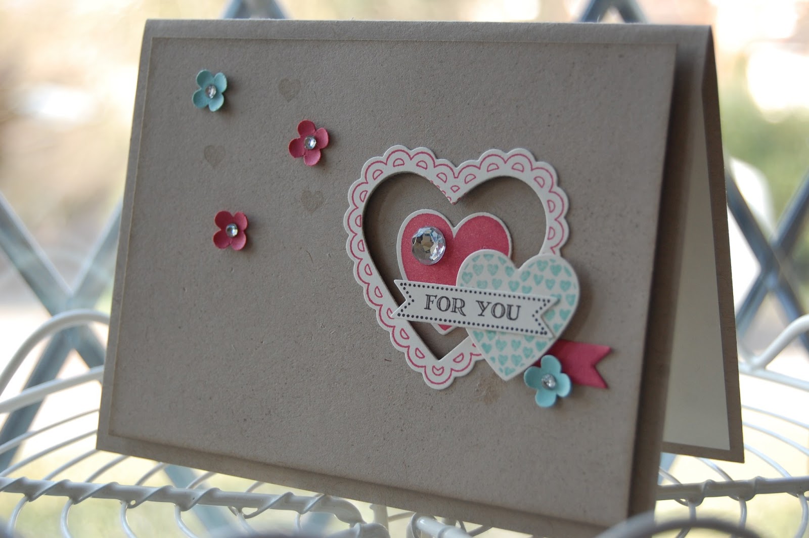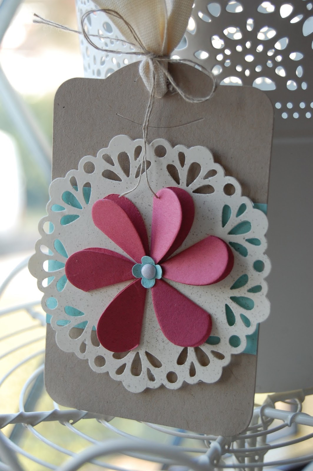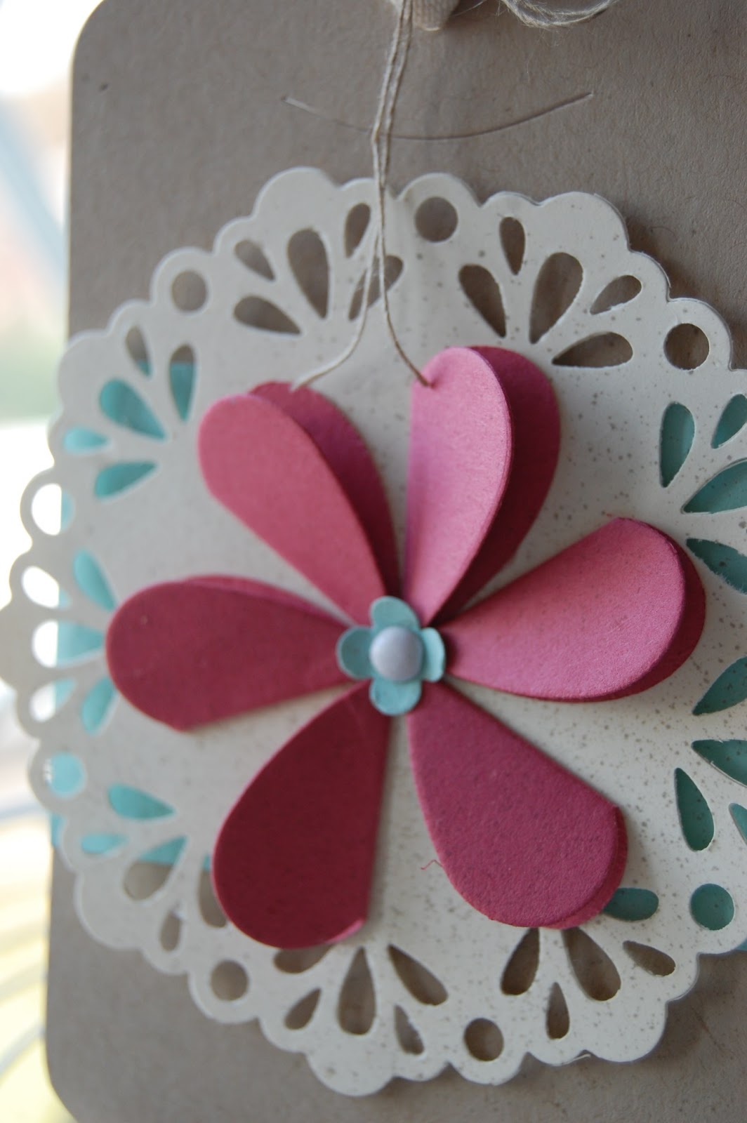 The final project was this lovely tag, using the Hearts Framelits dies to create a flower shape by folding the hearts in half.