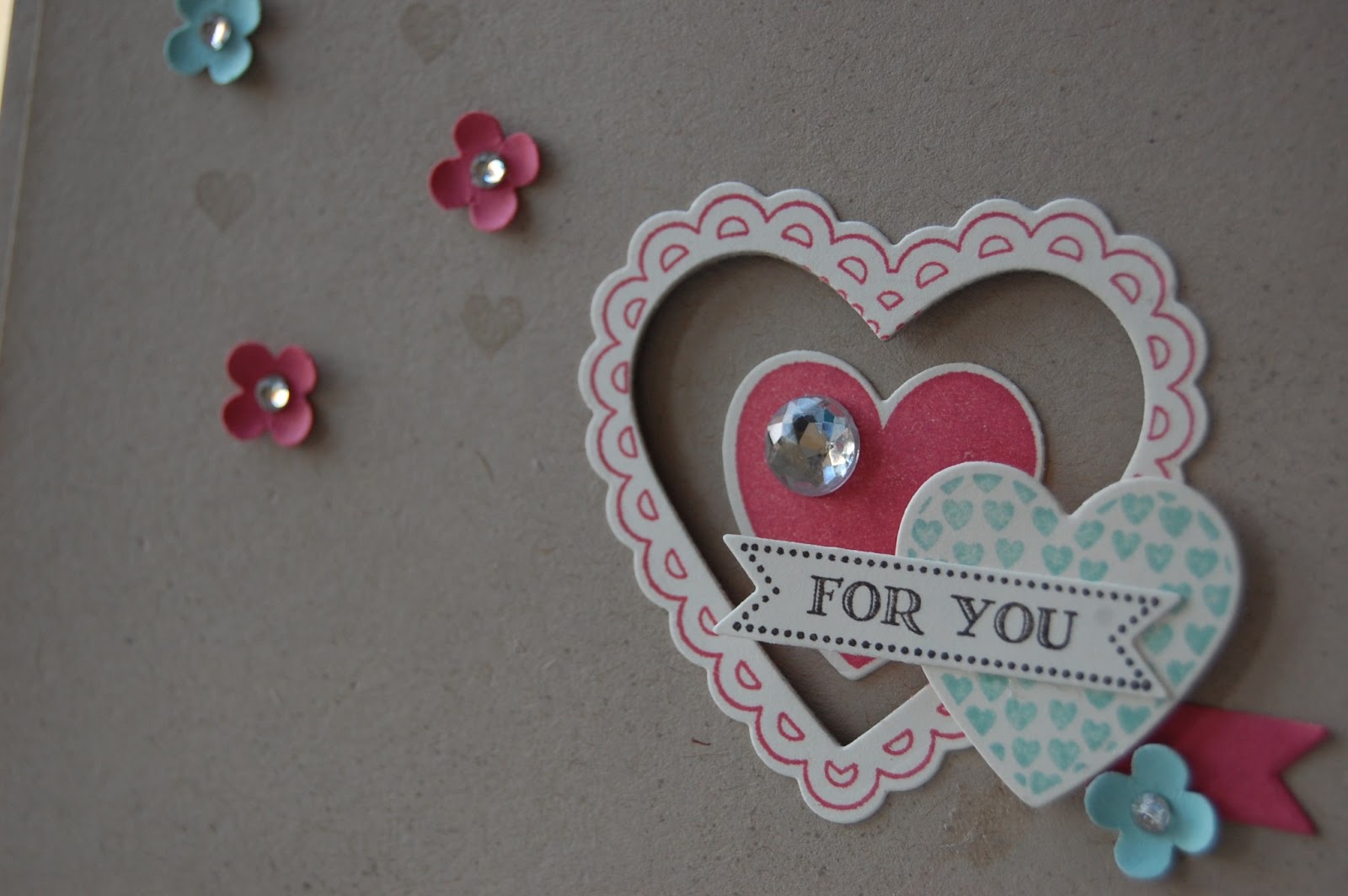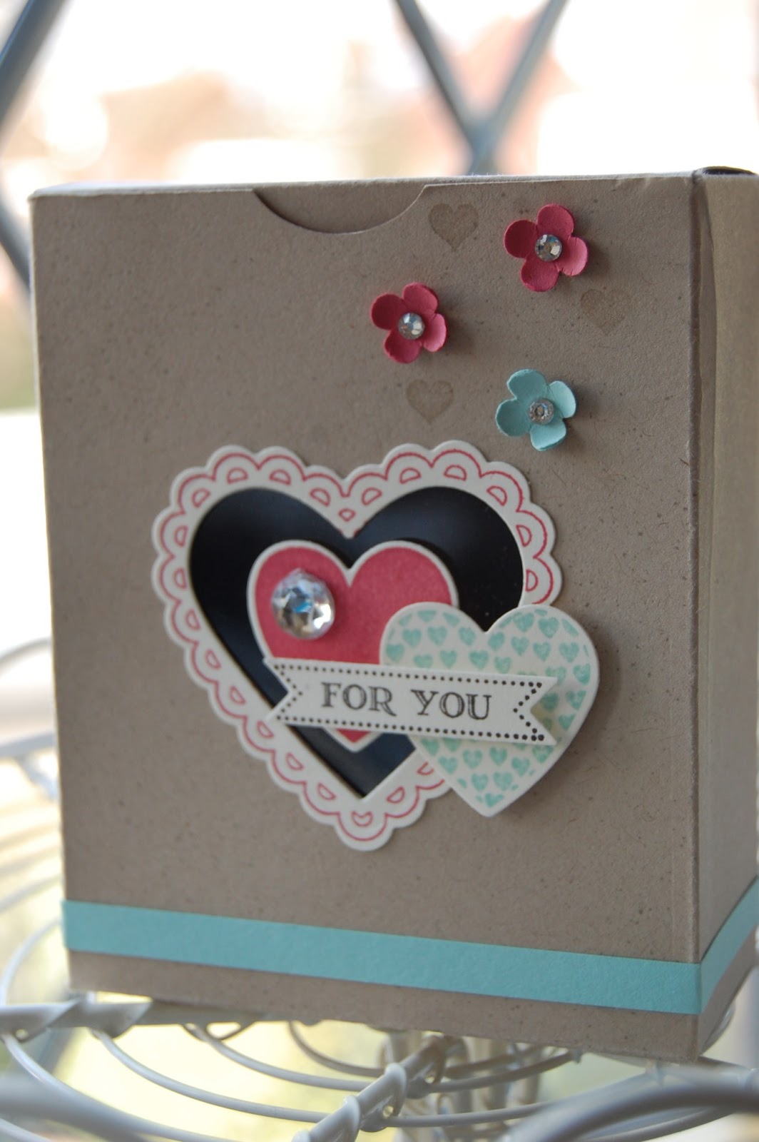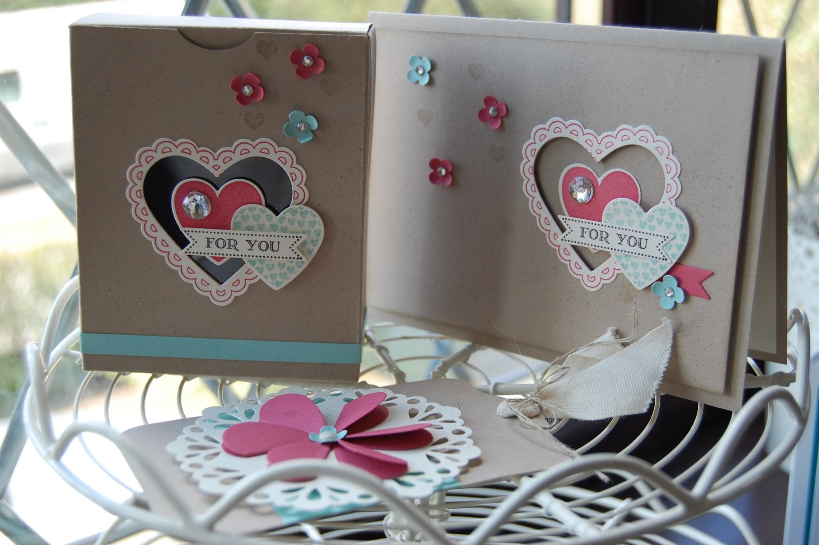 The final project was this lovely tag, using the Hearts Framelits dies to create a flower shape by folding the hearts in half.