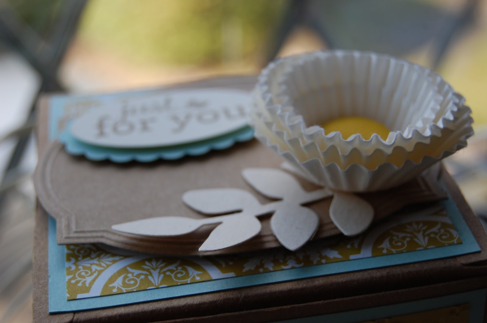 We used the “just for you” stamp which is included with the kit and punched out with the Oval Punch, layering with the Scallop Oval.