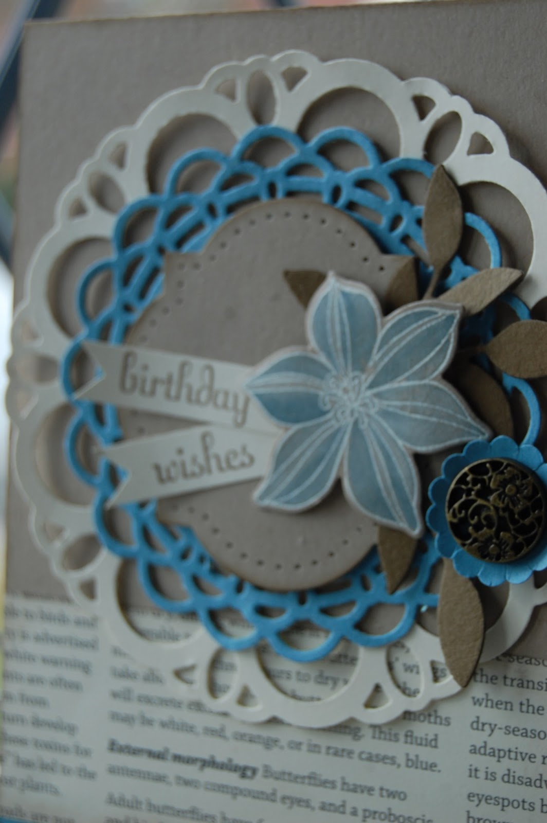 We used the Window Frames Framelits dies and co-ordinating “Festive” piercing pack to centre the doilies then added the flower, some “Little Leaves” and a gorgeous Antique Brad.