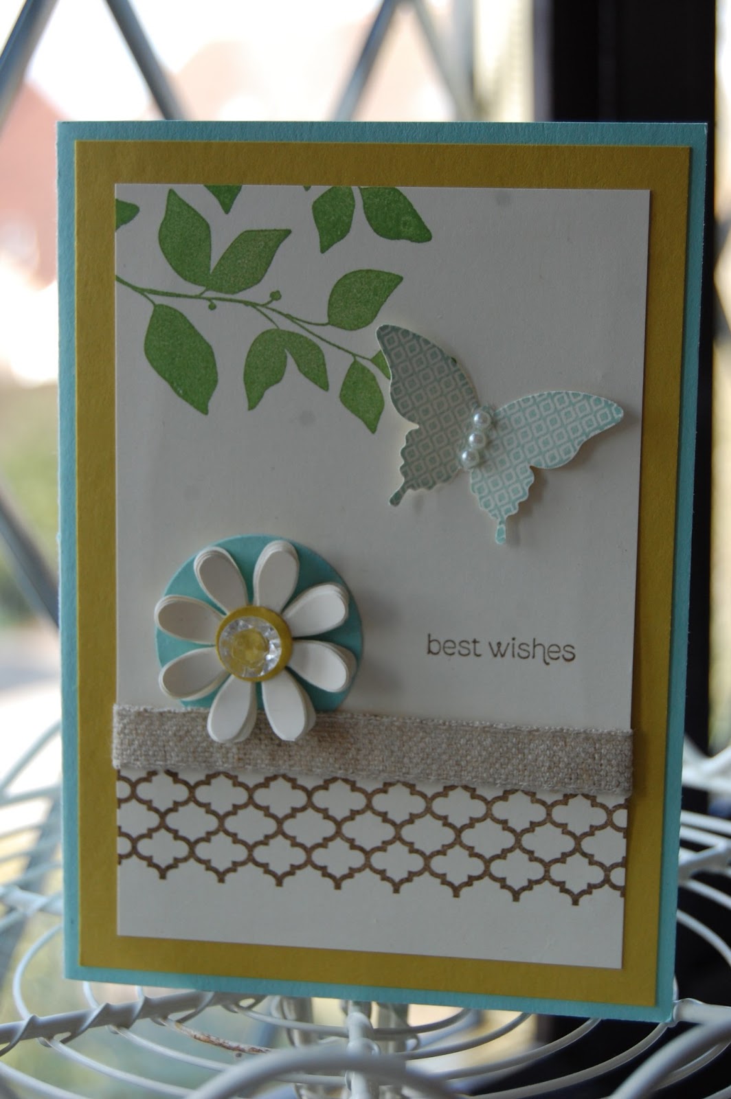The left and lattice pattern are both from the “Summer Silhouettes” stamp set and the Butterfly from the “Papillon Potpourri” set which also co-ordinates with the Elegant Butterfly Punch.
