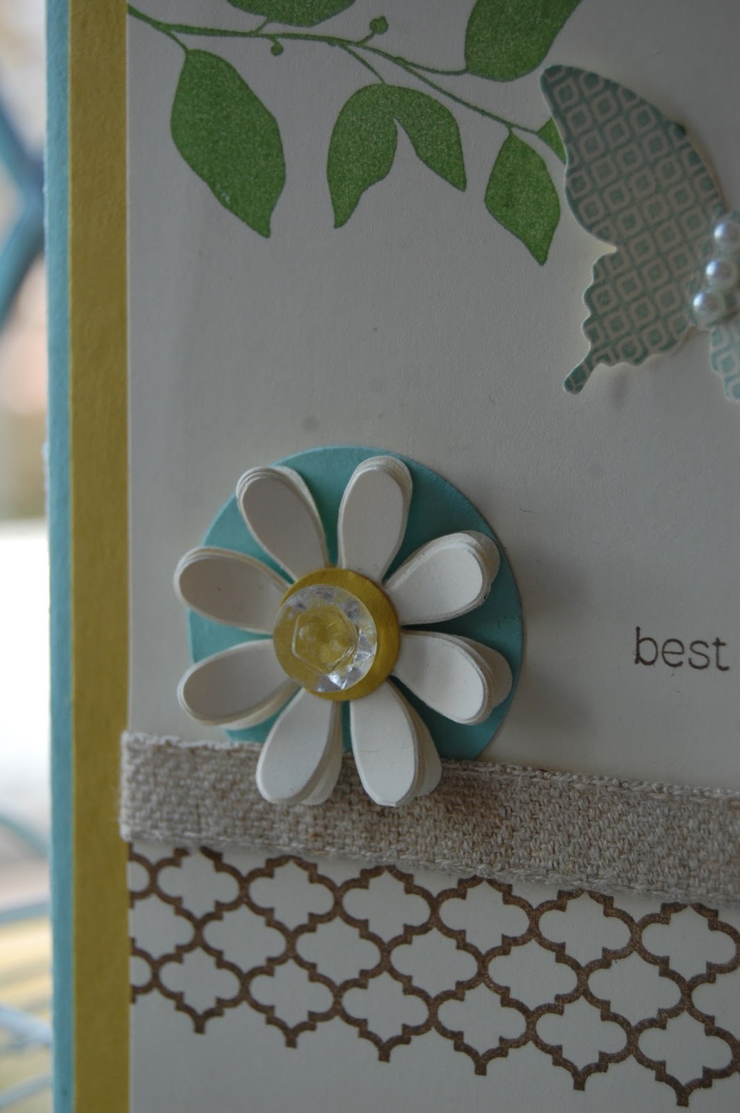 The daisy was cut using the “Blossom Party” die with the Big Shot, centred with a gorgeous Faceted Button.
