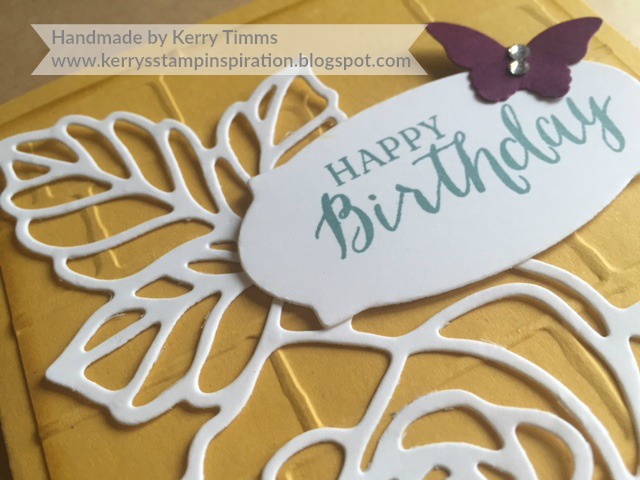 I ran the Rose Garden thinlits die through my big shot using Whisper White cardstock and attached it to a Brick Wall embossed layer of Hello Honey.