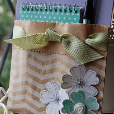 So the next item we made at my “Pretty Packaging” class was this notepad holder. During my trip to Salt Lake City for the Incentive Trip this year, we had napkins presented inside a Chevron Bag like this, with the ribbon tied through holes and I really liked the idea so used it to make a pouch. Inside we decorated…